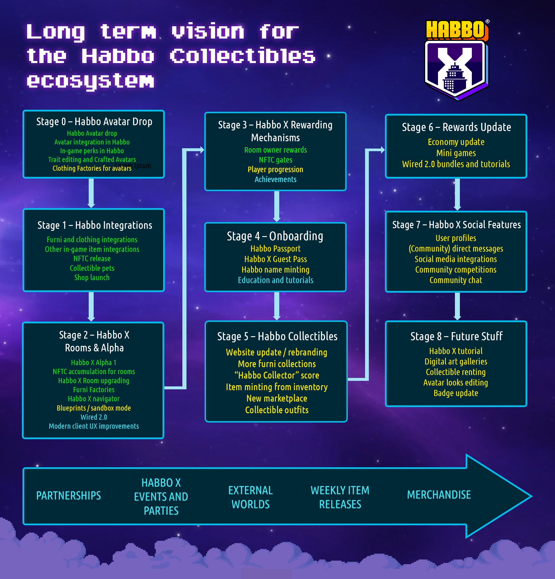 Transparenz und Klarheit sind unsere Leitprinzipien beim Aufbau des Habbo Sammelstücke-Ökosystems und von Habbo X. Um dem Wunsch der Community nach einer langfristigen Vision zu entsprechen, die zeigt, worauf wir unsere Bemühungen konzentrieren und welche Meilensteine wir zu erreichen hoffen, freuen wir uns, unseren bisherigen Weg und unsere nächsten Ziele zu präsentieren.
