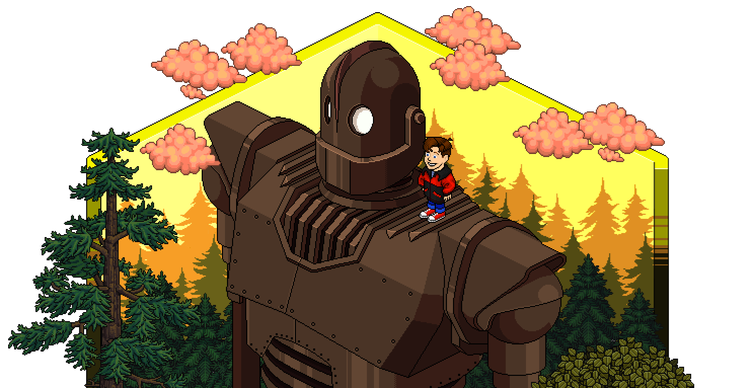 "That robot is some high quality pixel art, I love the color palette as well, didn't expect a giant pixelated robot. I feel like the kid's clothes could be less saturated, it's a bit eye-popping compared to the color scheme of the rest of the artwork, and I'd keep his face habbo style. Nonetheless a very impressive entry."